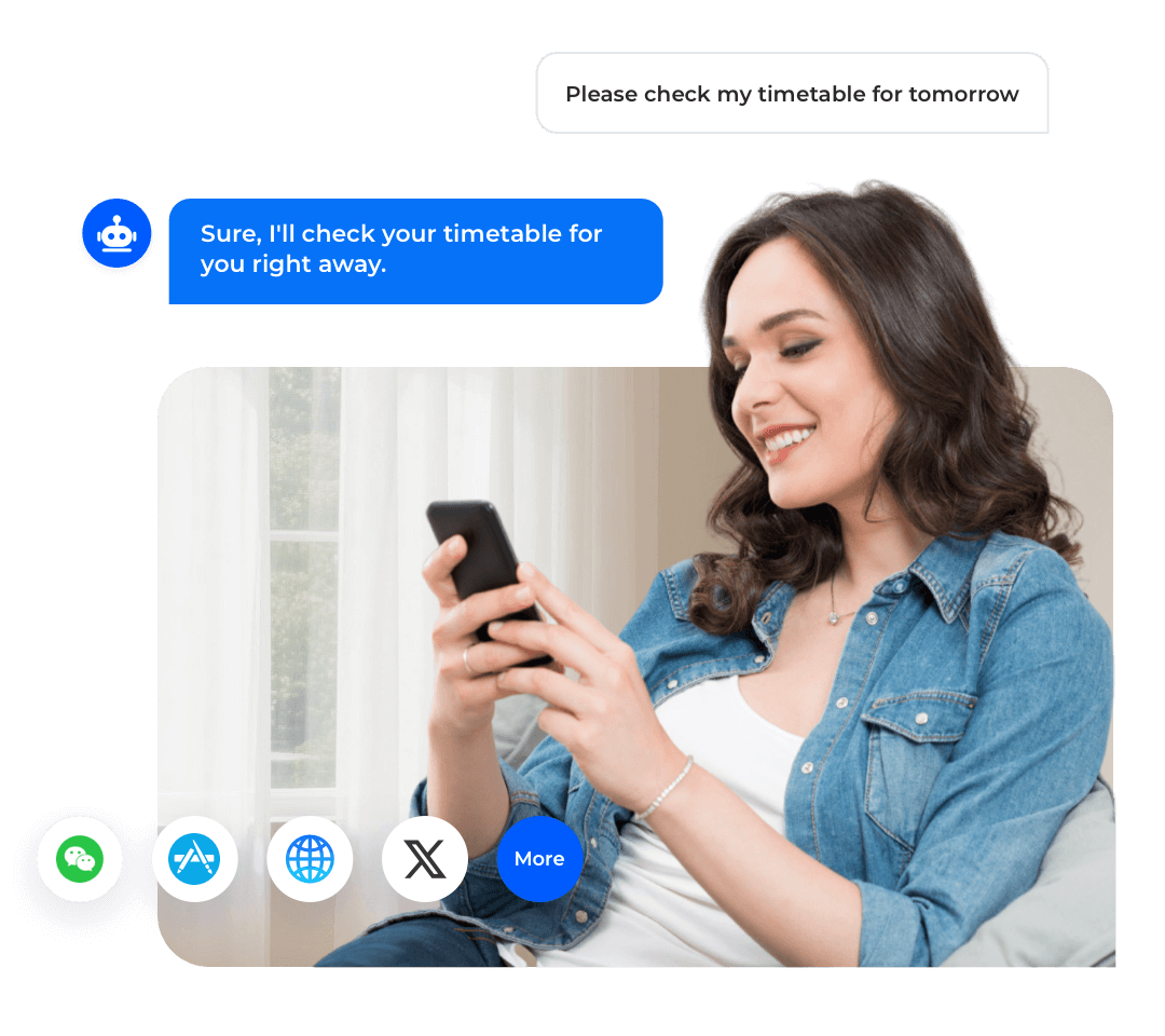 A student types "Check my class schedule" in the institution's WeChat Official Account. The AI text bot instantly retrieves and replies with a detailed timetable, and can guide them to complete actions like leave requests or material downloads.
