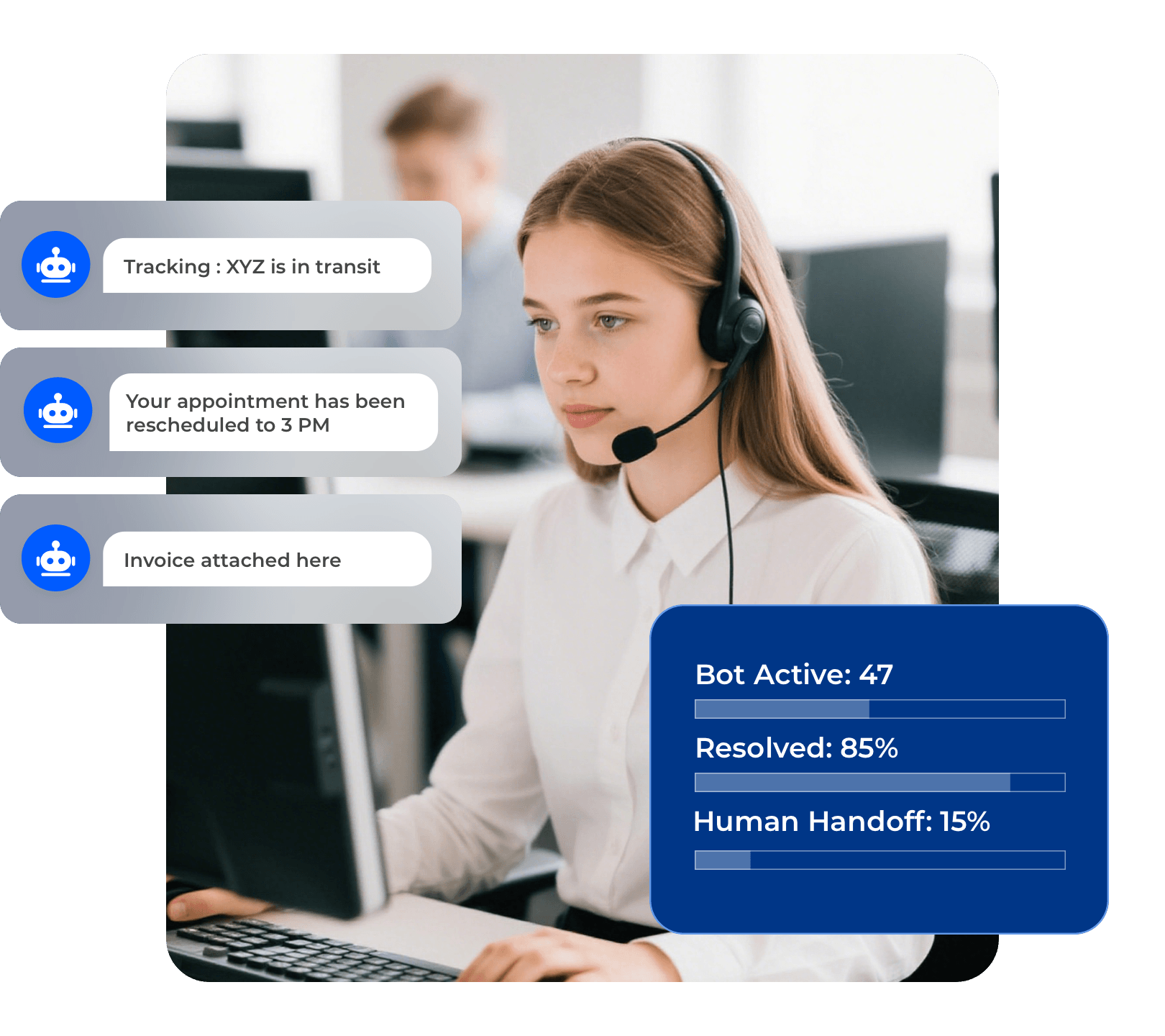 Customer starts a tracking inquiry on the website—bot responds instantly. When escalated to human agent, full conversation history syncs automatically—no repetition required. Follow-up call pre-fetches the tracking number. Customer: “You remember me.”