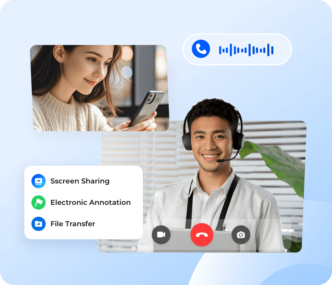 Agents can conduct real-time screen sharing, electronic whiteboard annotation and file transfer, providing on-site-like guidance that significantly boosts explanation efficiency and issue resolution rates.